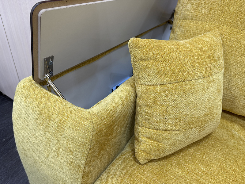 Диван, оттоманка, дополнительный кресельный модуль, а также подлокотники оснащены бельевым коробом из ламинированного ЛДСП. Деревянные накладки на подлокотниках выполнены из МДФ – их цвет тоже можно изменить.