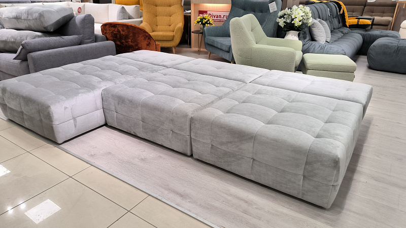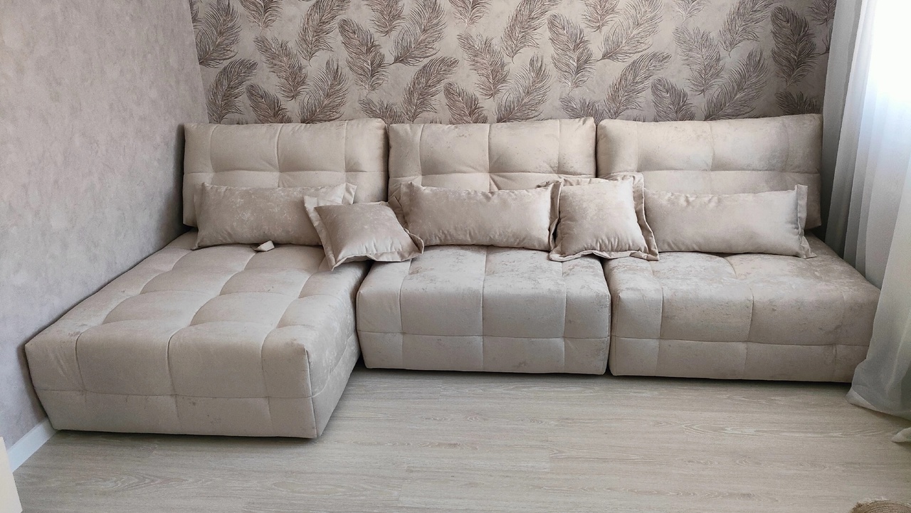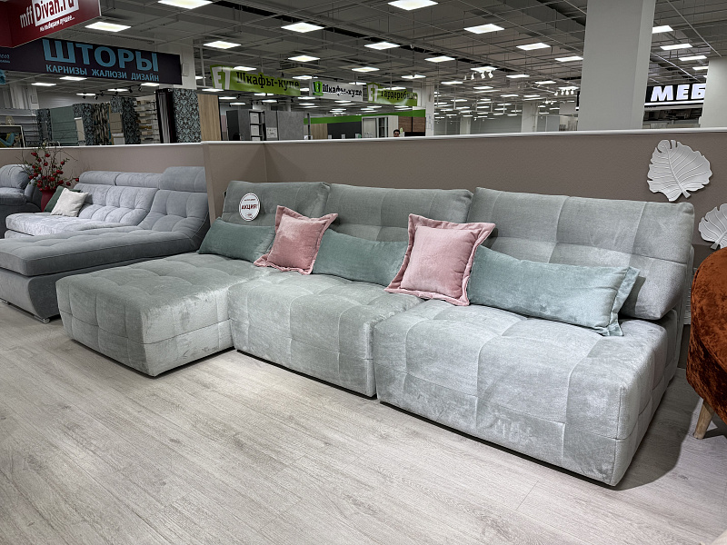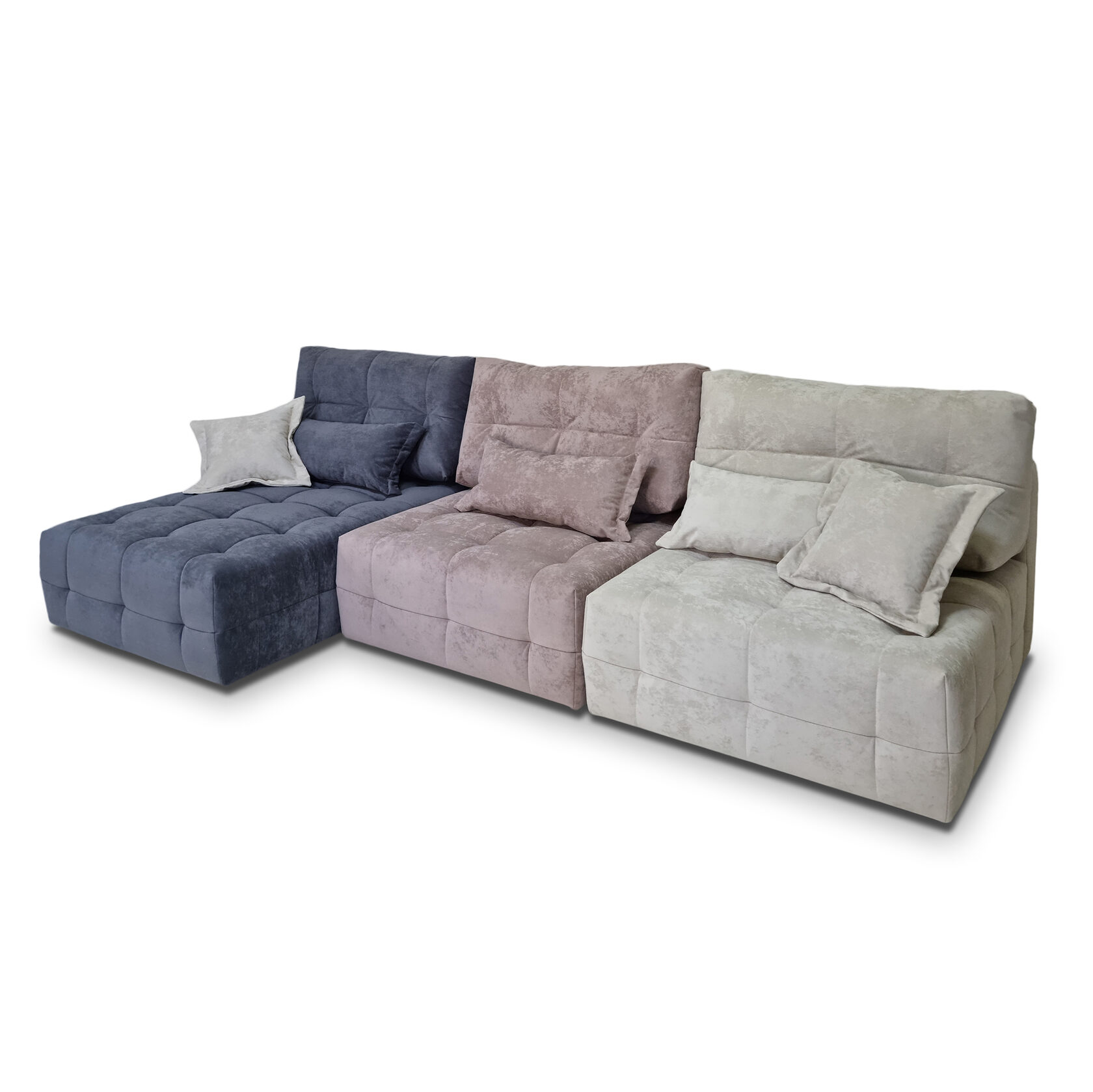 Дизайн дивана придётся по вкусу ценителям всего оригинального: «квадратная» утяжка модулей по всему периметру – диван подходит для зонирования помещения, геометрию данной модели также дополняют стильные подушки для спины.