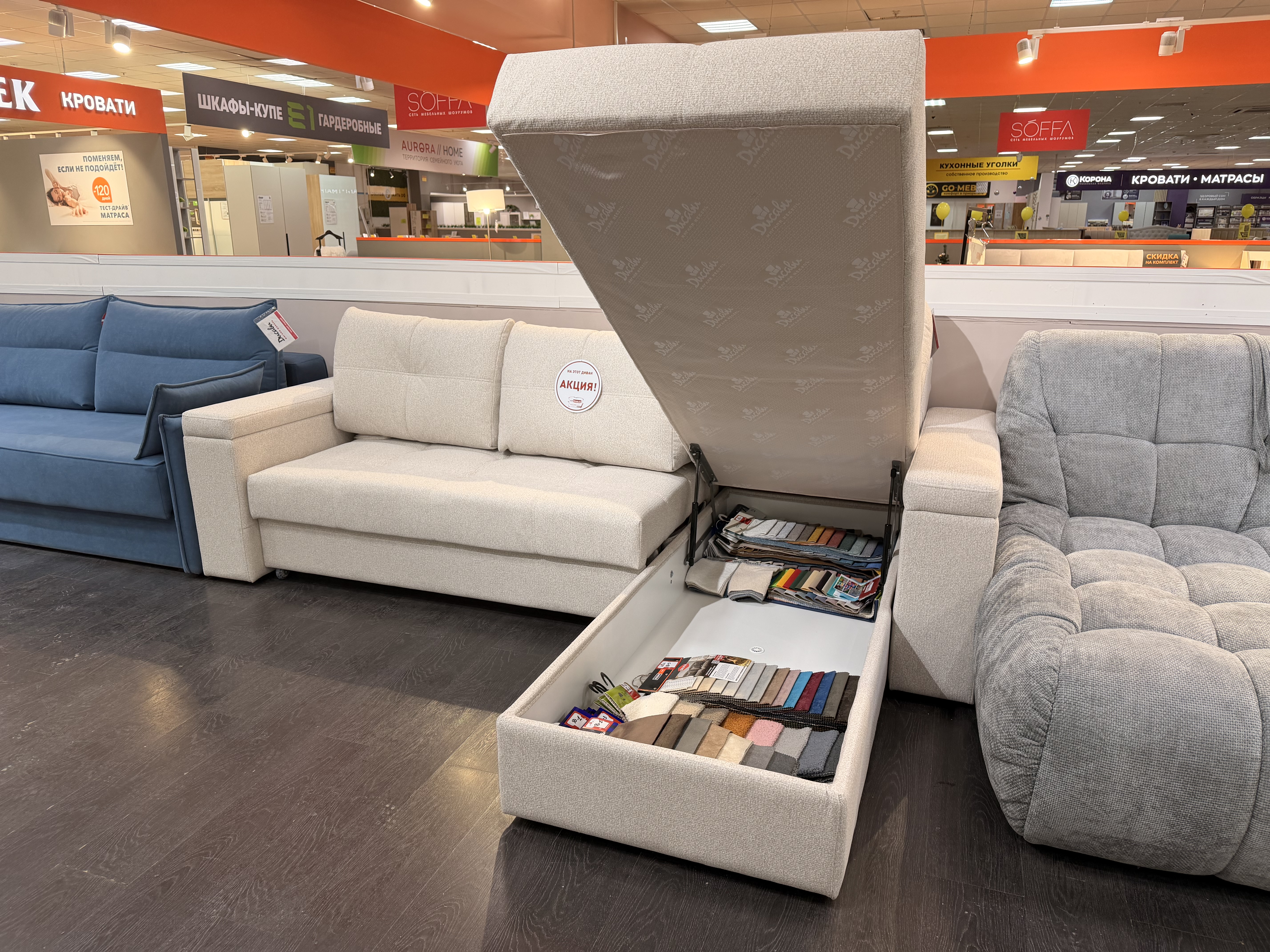 Современный дизайн, комфортное спальное место, а также большой ящик для хранения спальных принадлежностей совмещает в себе многофункциональный диван «Остин» выкатной с оттоманкой.