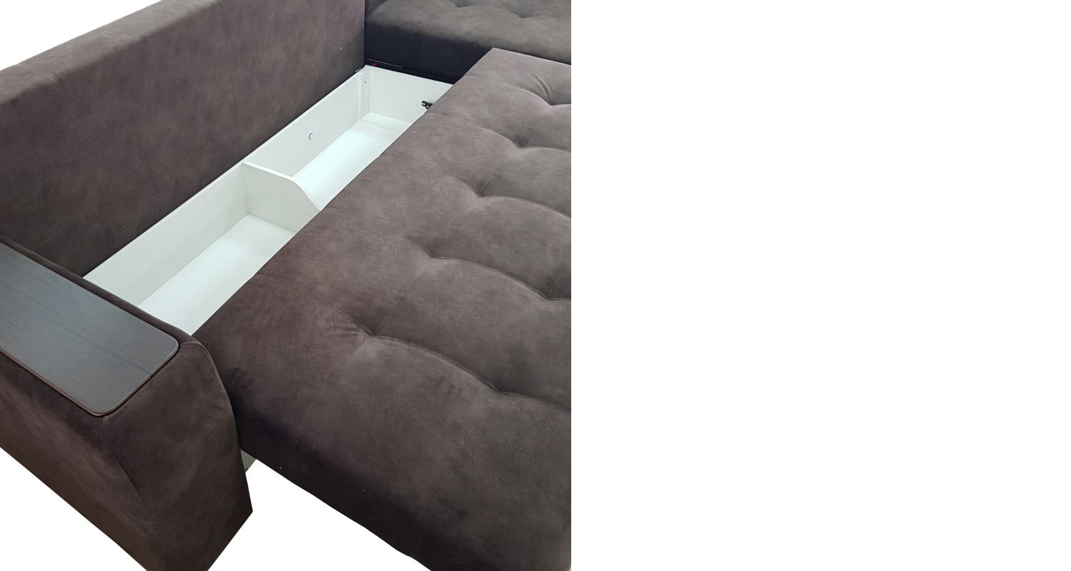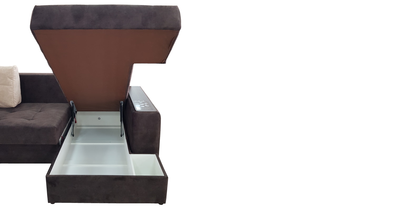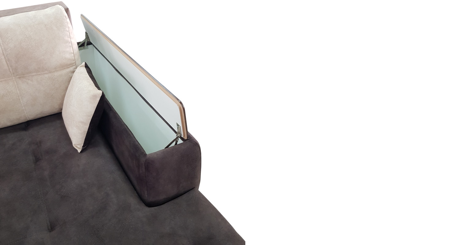 Диван, оттоманка, дополнительный кресельный модуль, а также подлокотники оснащены бельевым коробом из ламинированного ЛДСП. Деревянные накладки на подлокотниках выполнены из МДФ – их цвет тоже можно изменить.
