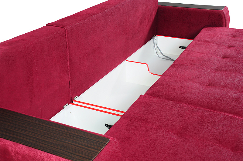 Диван, оттоманка, дополнительный кресельный модуль, а также подлокотники оснащены бельевым коробом из ламинированного ЛДСП. Деревянные накладки на подлокотниках выполнены из МДФ – их цвет тоже можно изменить.