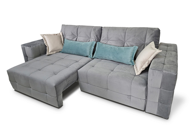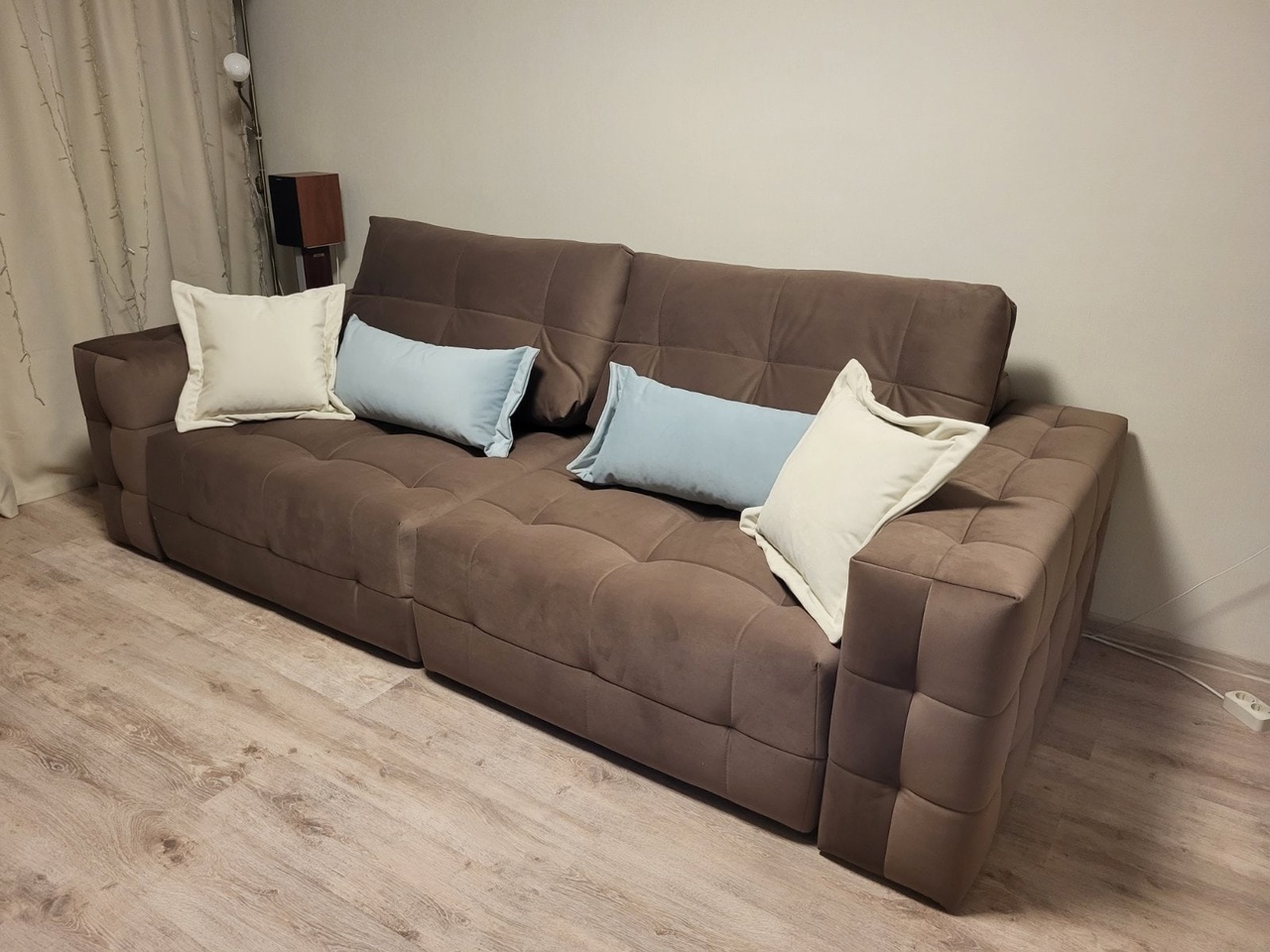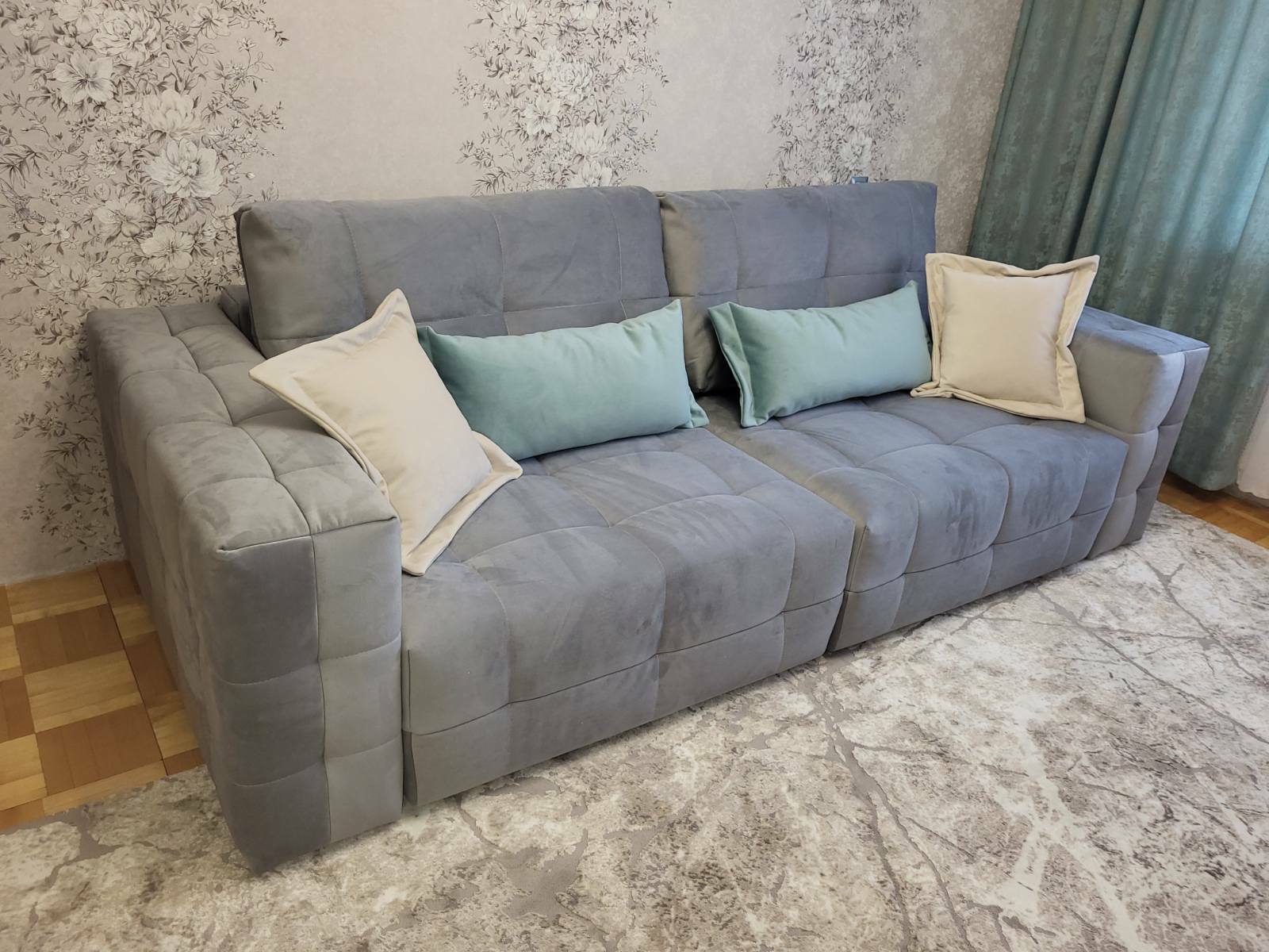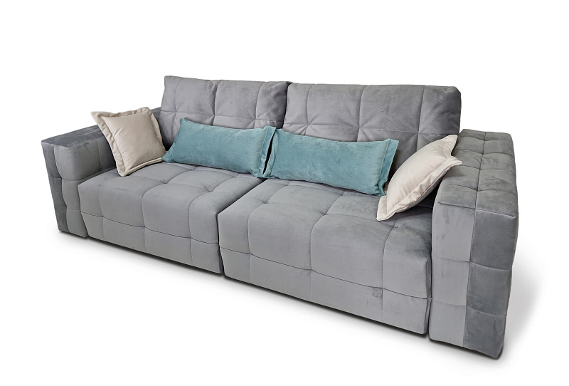 Дизайн дивана придётся по вкусу ценителям всего оригинального: «квадратная» утяжка модулей по всему периметру – диван подходит для зонирования помещения, геометрию данной модели также дополняют стильные подушки для спины.