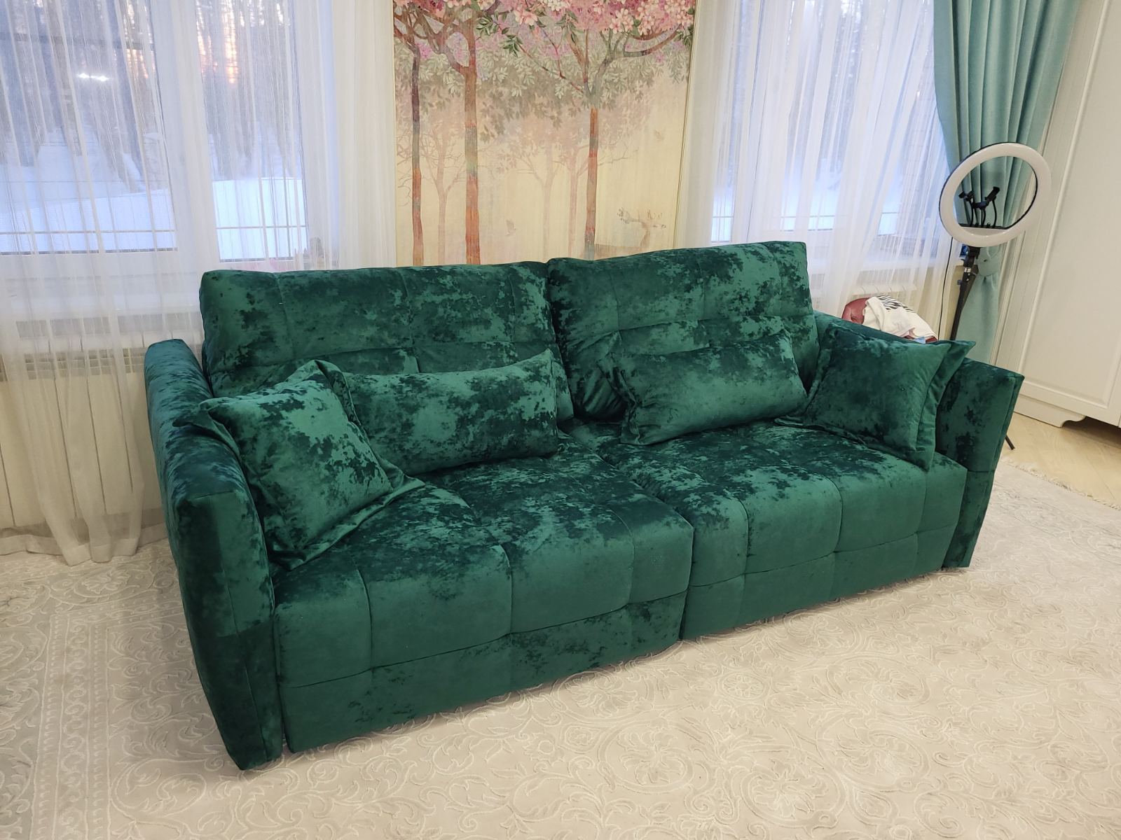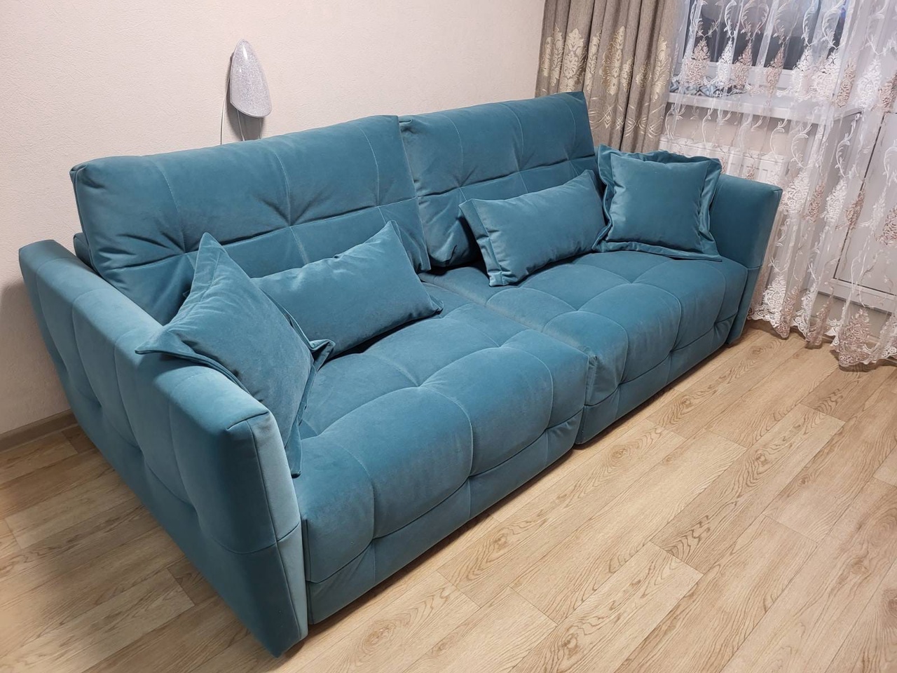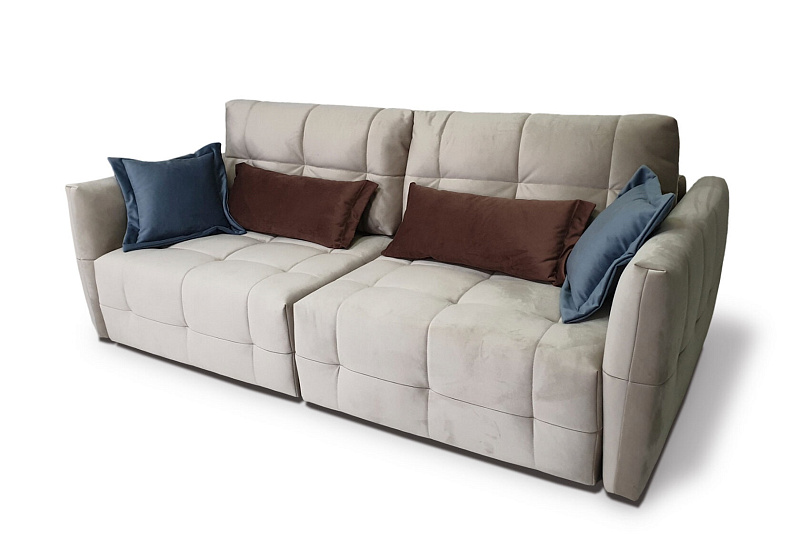 Дизайн дивана придётся по вкусу ценителям всего оригинального: «квадратная» утяжка модулей по всему периметру – диван подходит для зонирования помещения, геометрию данной модели также дополняют стильные подушки для спины.