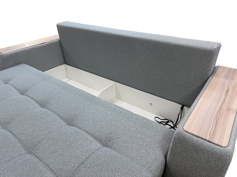 Диван, оттоманка, дополнительный кресельный модуль, а также подлокотники оснащены бельевым коробом из ламинированного ЛДСП. Деревянные накладки на подлокотниках выполнены из МДФ – их цвет тоже можно изменить.