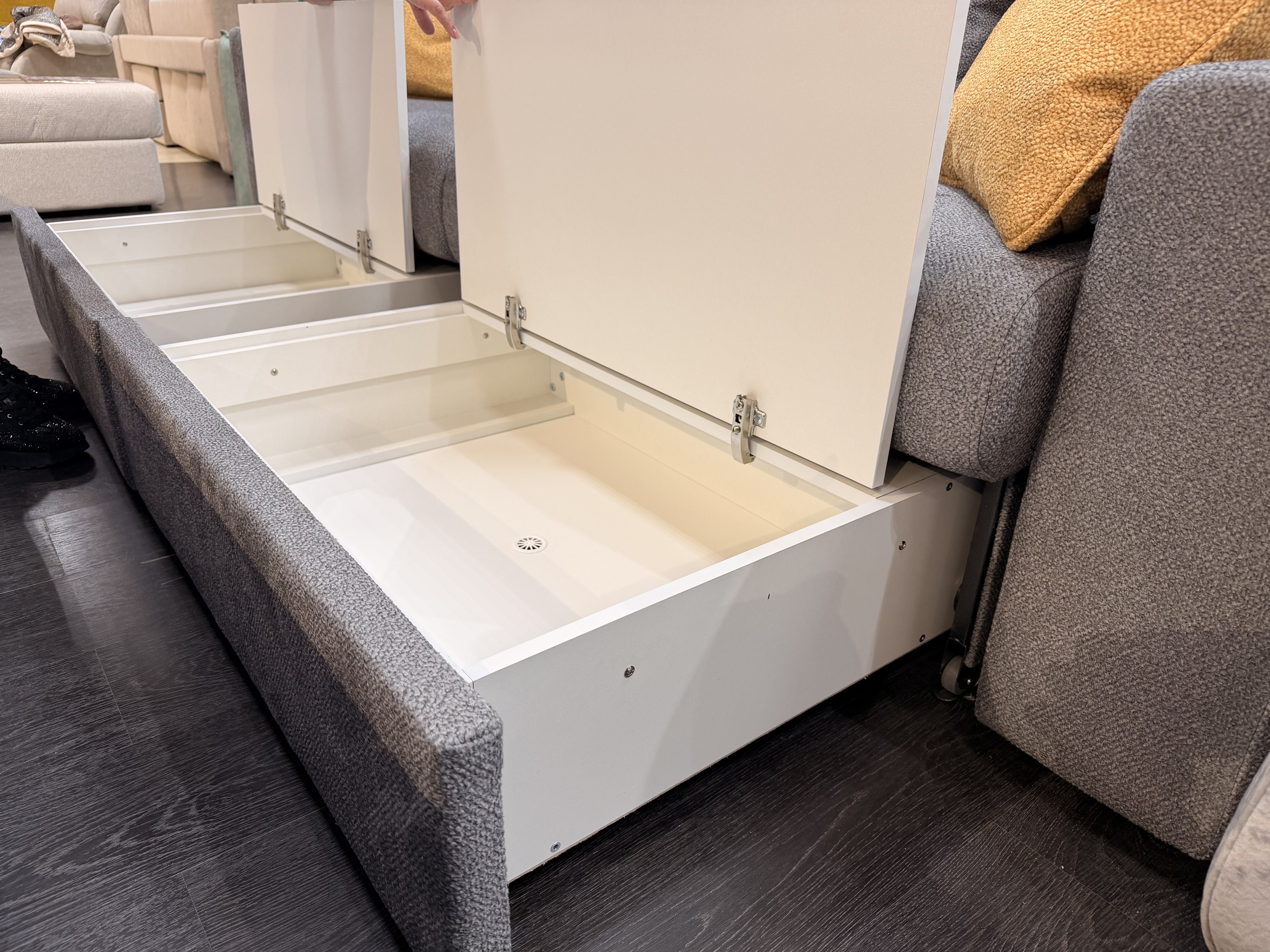 Внутри дивана "Триумф" находятся два короба для белья. Диван доступен к заказу в других тканях. Декоративные подушки входят в комплект. Ознакомиться с палитрой мебельной ткани для вашего дивана "Триумф" приглашаем в наши фирменные салоны по адресам: г. Самара, ул. Дыбенко, 33 Центр Мебели DOM, 2 этаж, ул. 22 Партсъезда, 1\2, ТЦ "Победа", 2 этаж, ул. Революционная, д. 70, МЦ Мягкофф, 1 этаж.