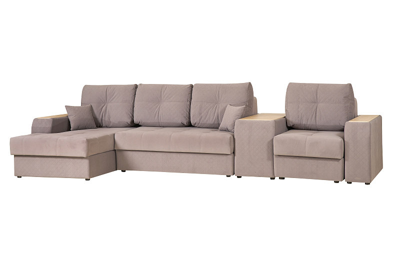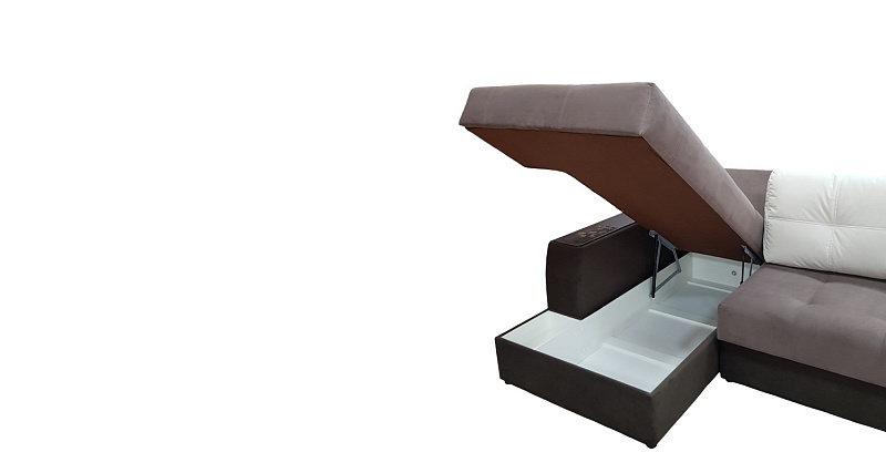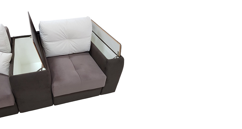 Диван, оттоманка, дополнительный кресельный модуль, а также подлокотники оснащены бельевым коробом из ламинированного ЛДСП. Деревянные накладки на подлокотниках выполнены из МДФ – их цвет тоже можно изменить.