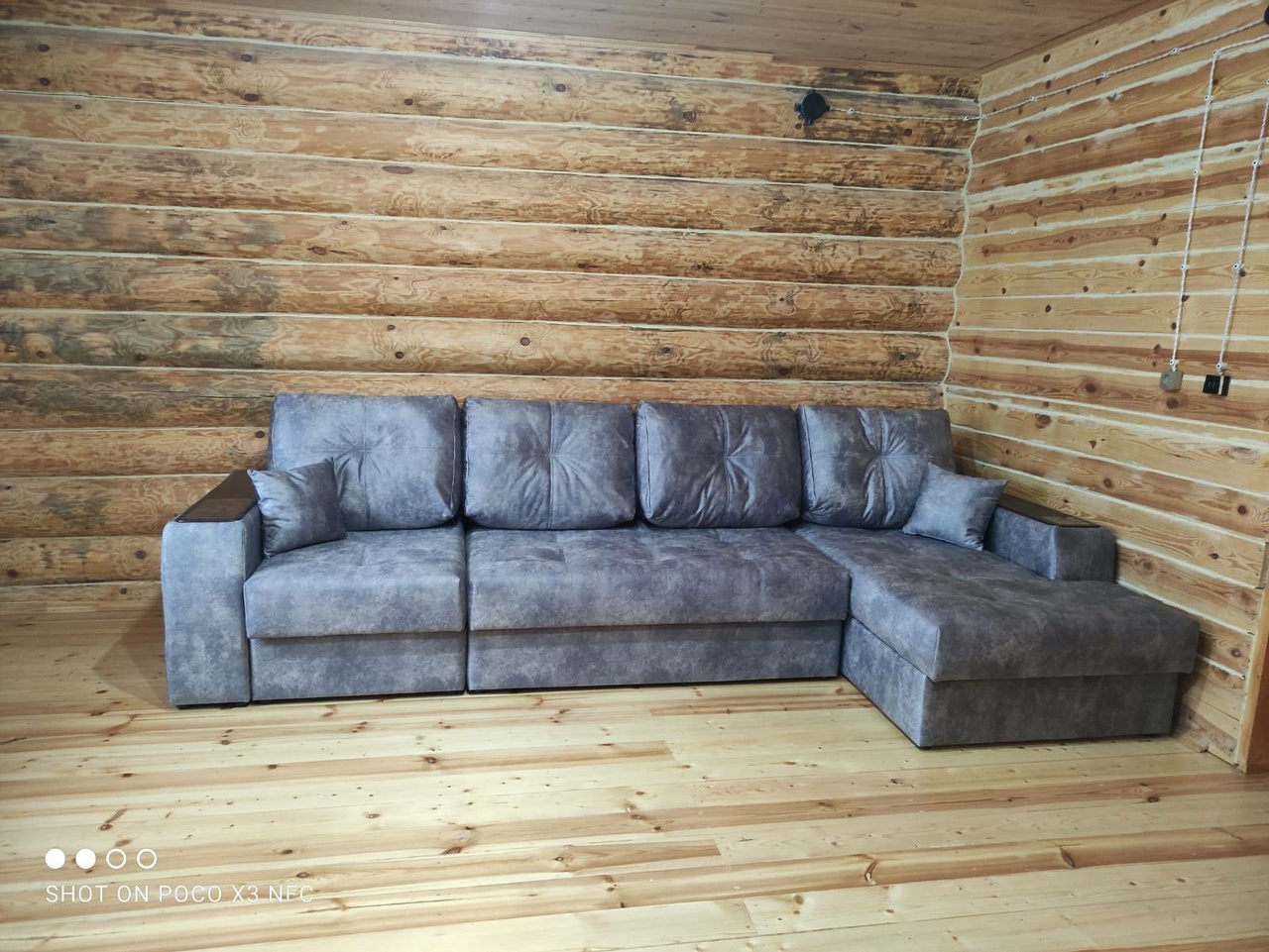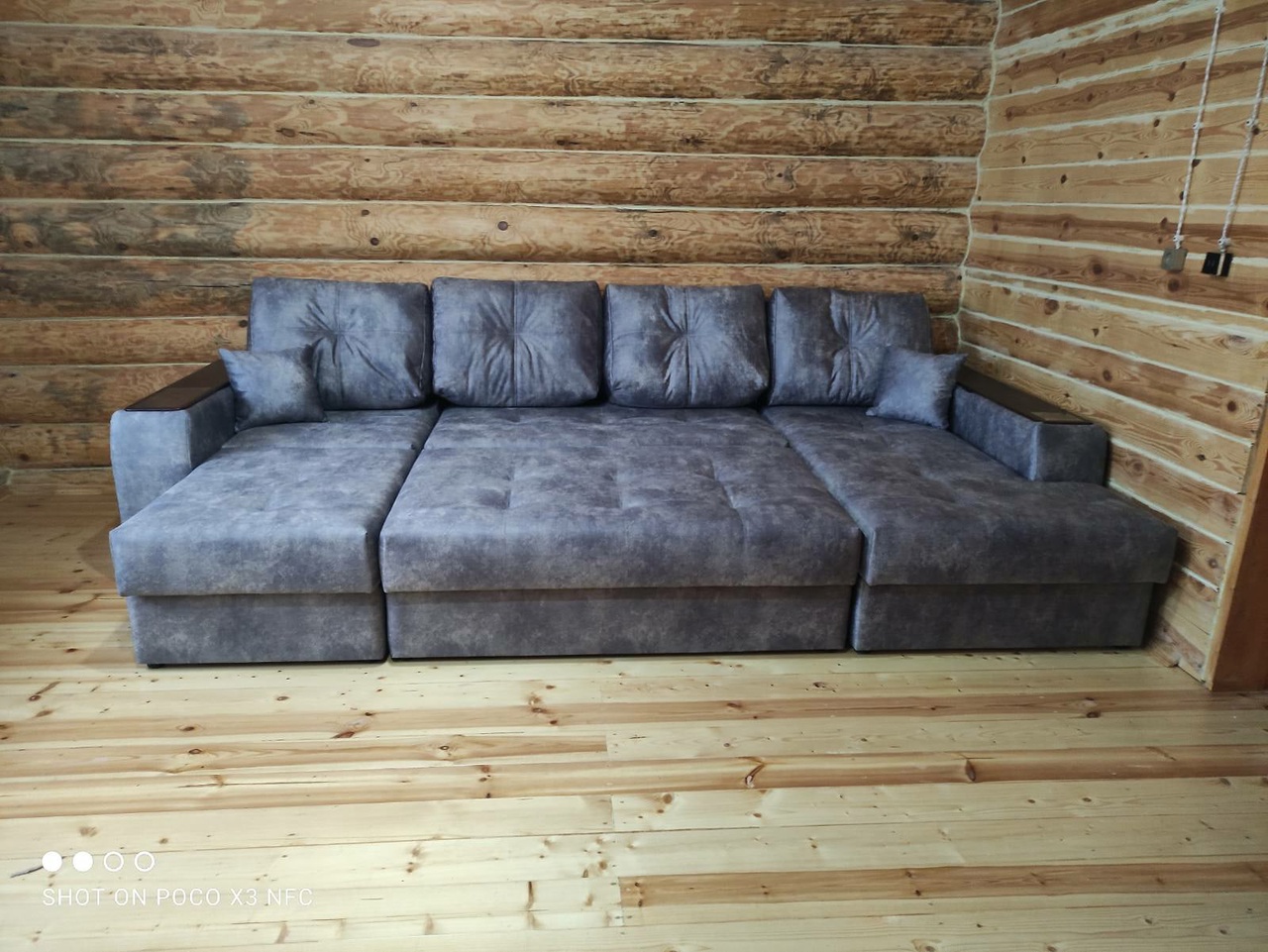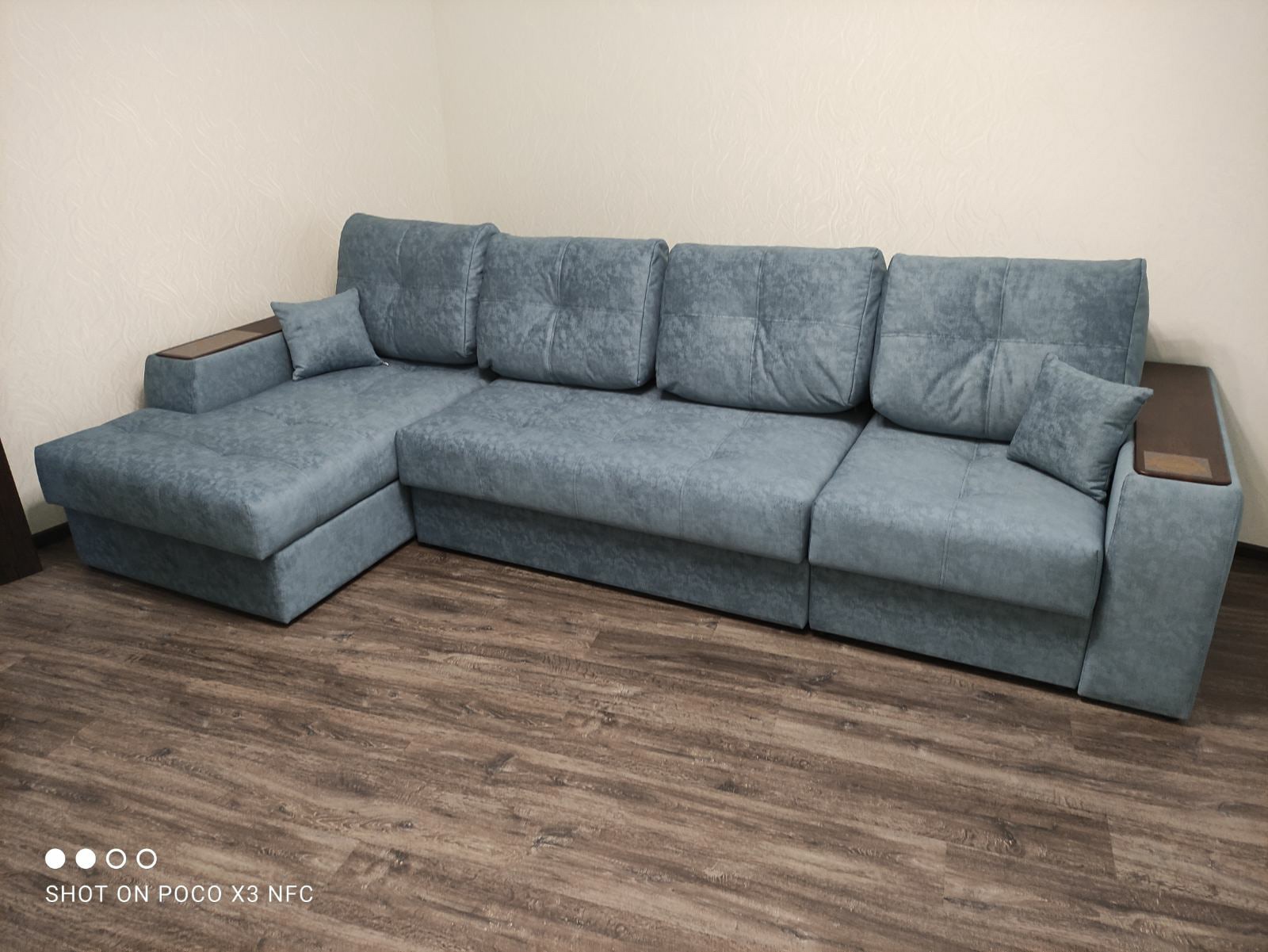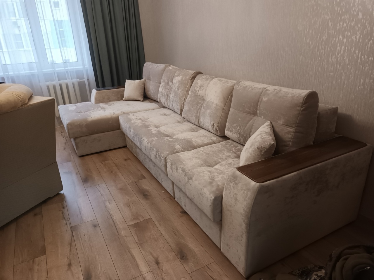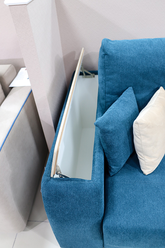 Диван, оттоманка, дополнительный кресельный модуль, а также подлокотники оснащены бельевым коробом из ламинированного ЛДСП. Деревянные накладки на подлокотниках выполнены из МДФ – их цвет тоже можно изменить.