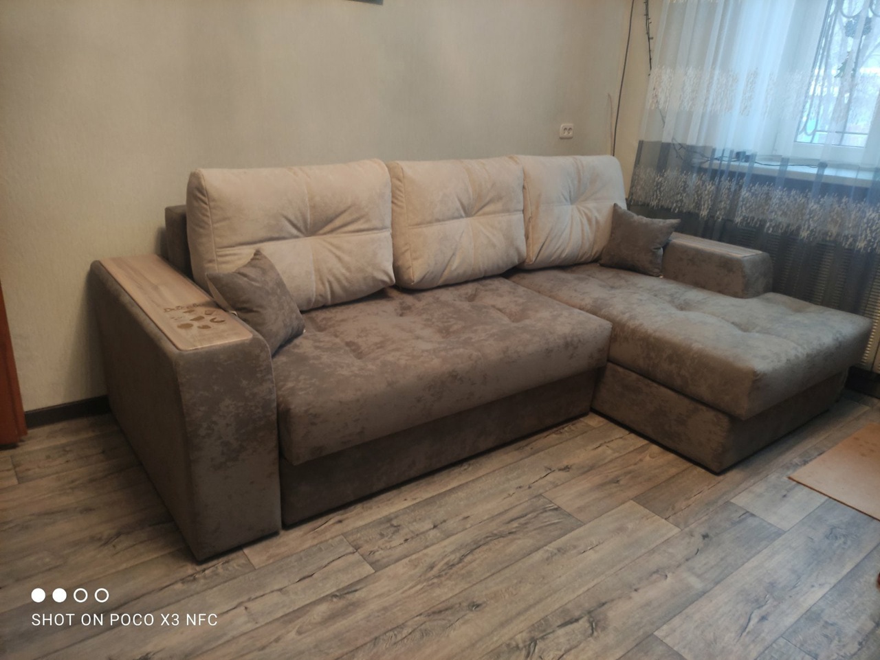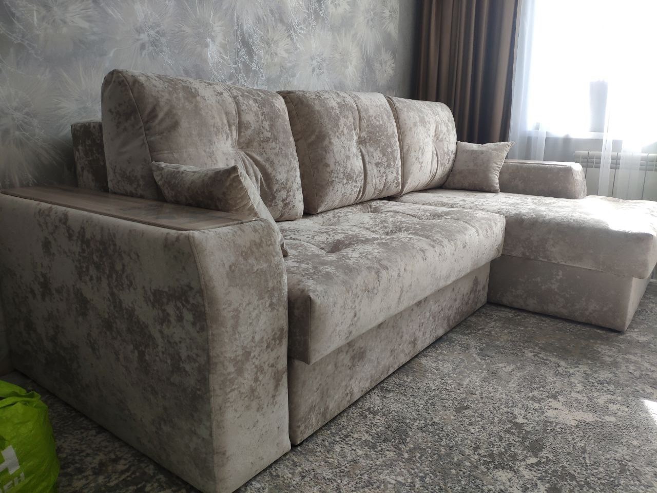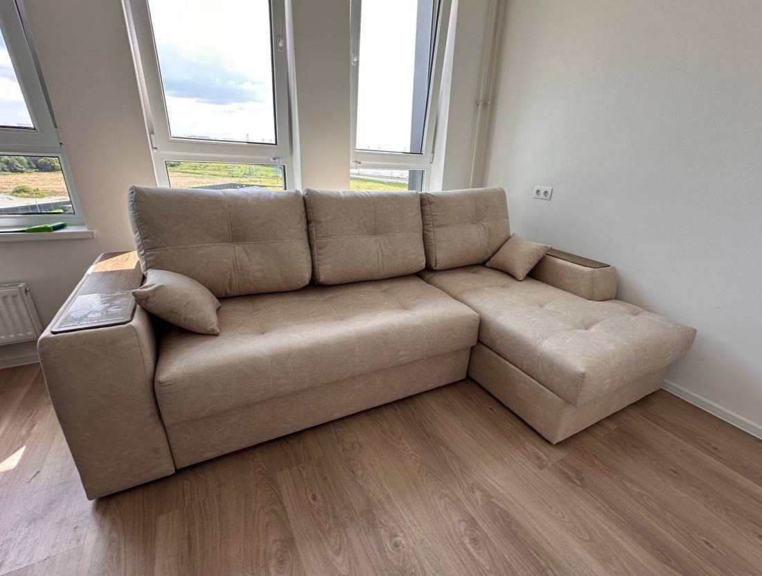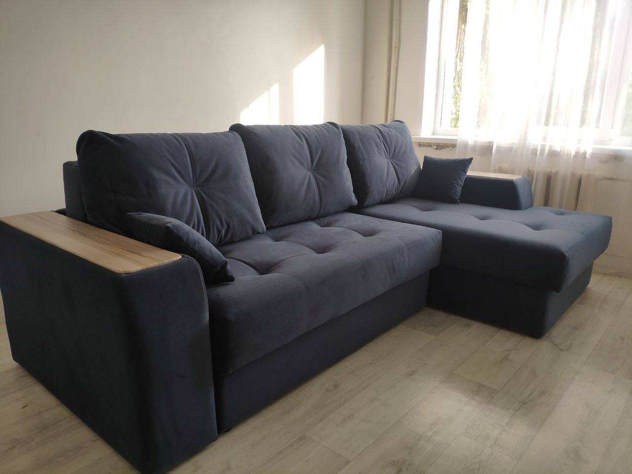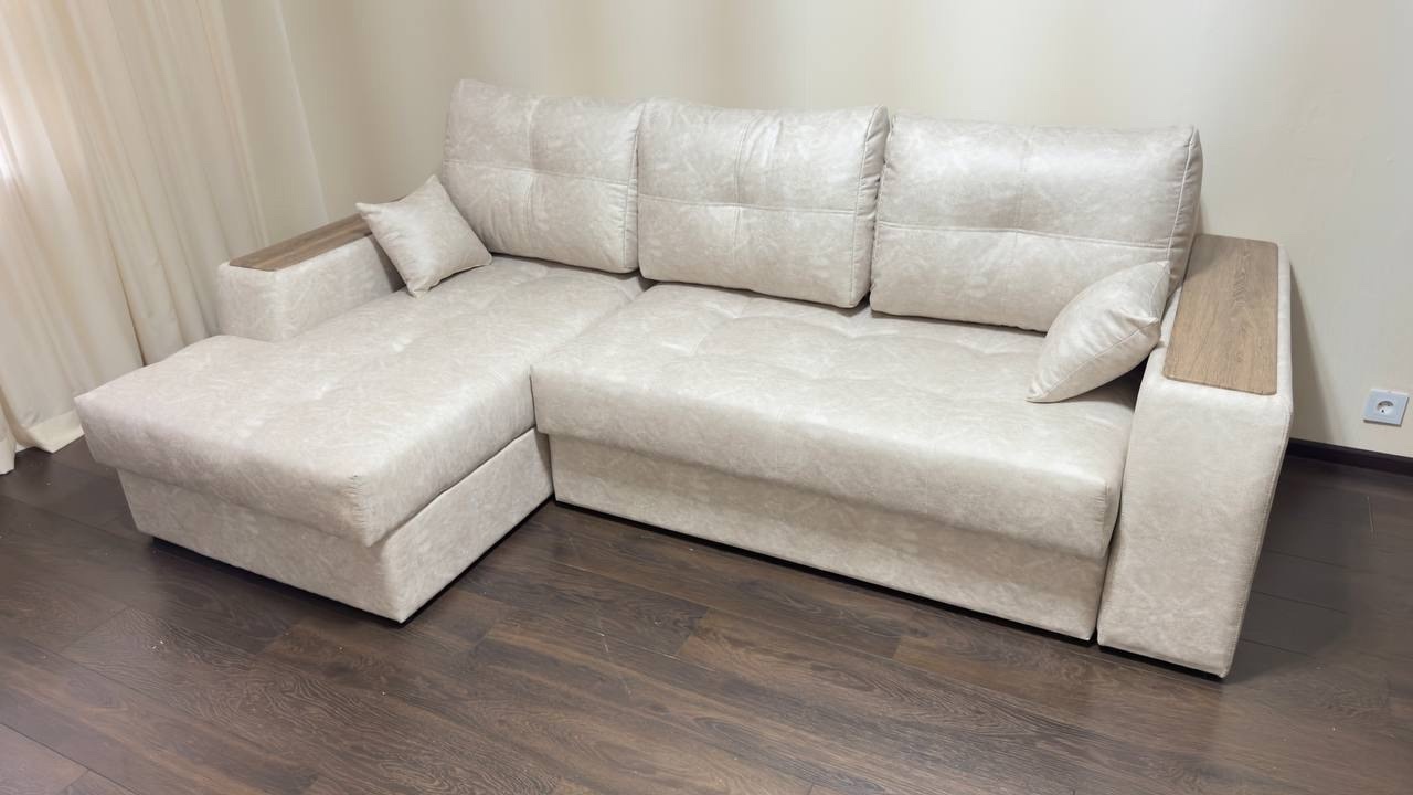 Диван, оттоманка, дополнительный кресельный модуль, а также подлокотники оснащены бельевым коробом из ламинированного ЛДСП. Деревянные накладки на подлокотниках выполнены из МДФ – их цвет тоже можно изменить.