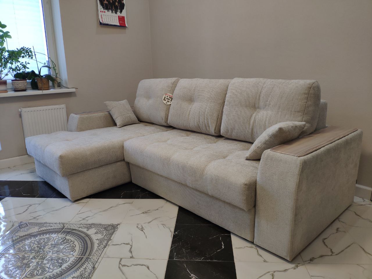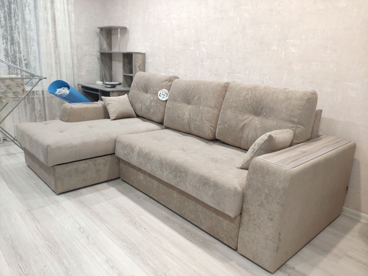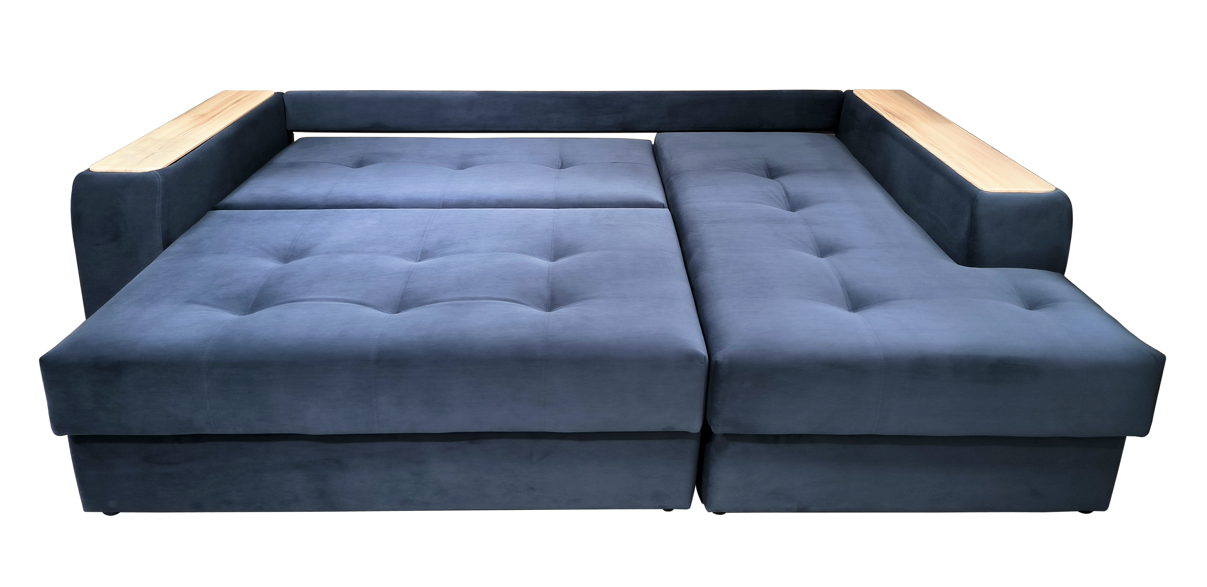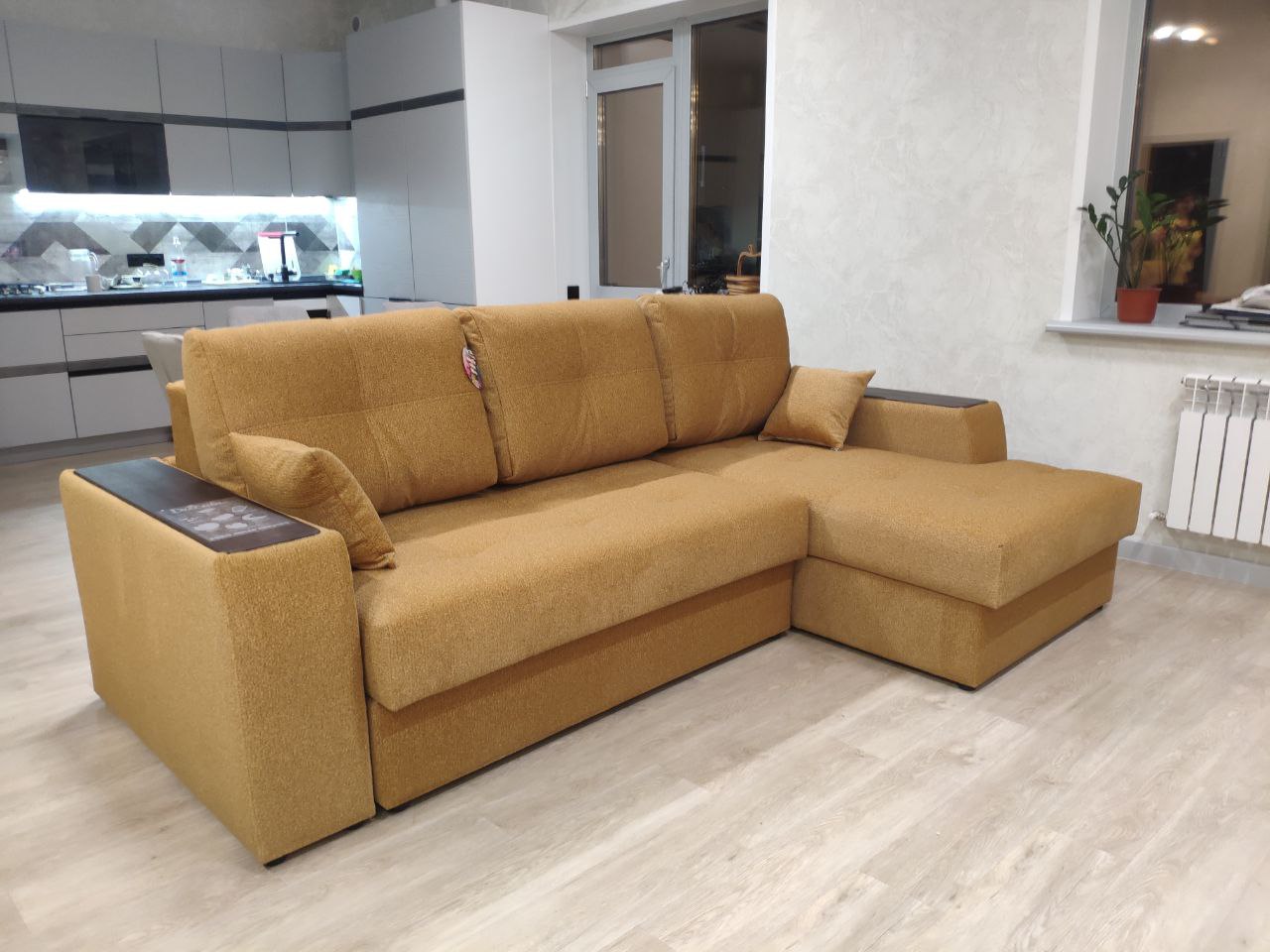 Диван, оттоманка, дополнительный кресельный модуль, а также подлокотники оснащены бельевым коробом из ламинированного ЛДСП. Деревянные накладки на подлокотниках выполнены из МДФ – их цвет тоже можно изменить.