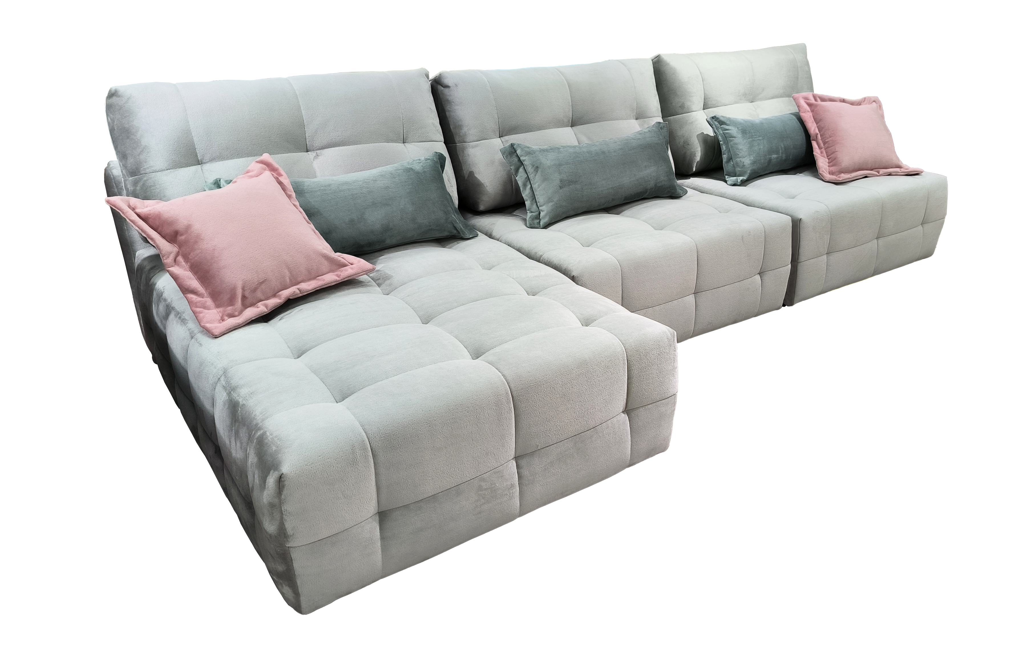 Дизайн дивана придётся по вкусу ценителям всего оригинального: «квадратная» утяжка модулей по всему периметру – диван подходит для зонирования помещения, геометрию данной модели также дополняют стильные подушки для спины.