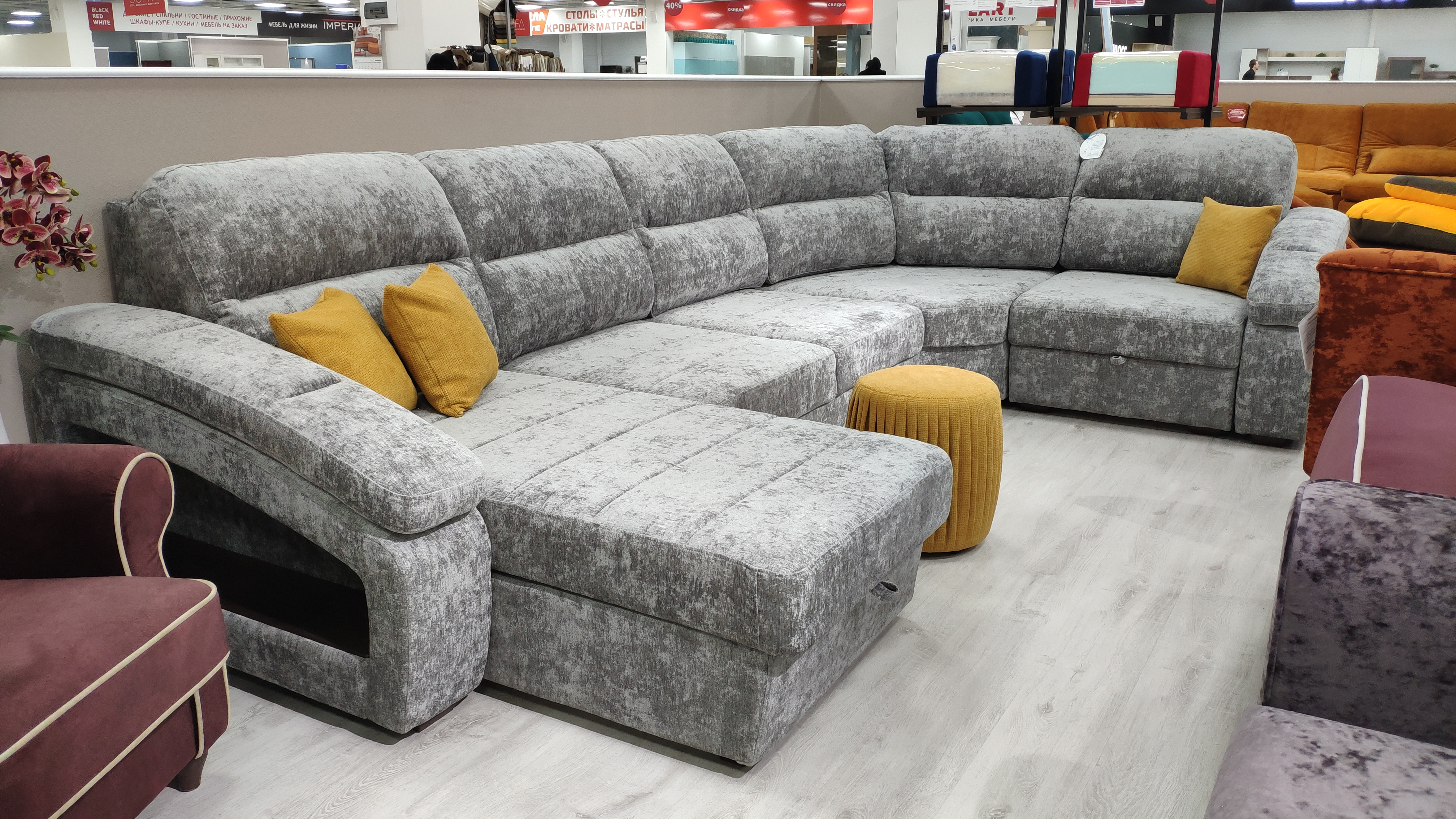 Модель «Орлеан» обладает оригинальным дизайном и максимально высоким сочетанием свойств комфортного дивана и полноценной кровати. Интересно выполнены боковины дивана: внутри подлокотника располагается ниша с накладкой из МДФ, сам подлокотник имеет скругленный дизайн, который идеально сочетается с формой подушек для спины. Благодаря своей модульности модель серии «Орлеан» позволяет создавать диван, подходящий под размеры вашей комнаты. Диван можно дополнить оттоманкой, а также дополнительным кресельным модулем.